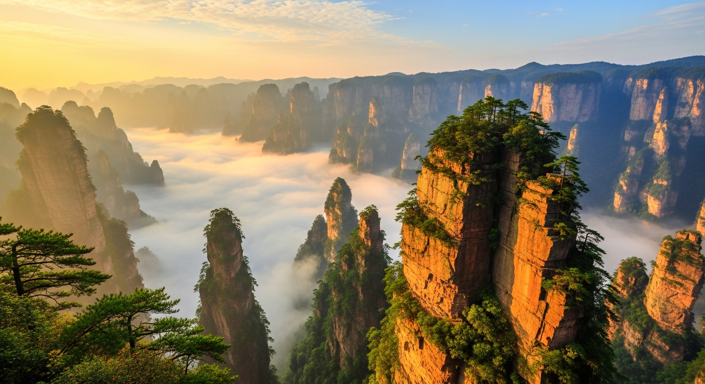 '아바타'의 영감이 된 초현실적인 풍경을 경험해 보세요. 안개에 싸인 사암 기둥 사이를 여행하고, 유리 스카이워크를 건너며, 중국 최초의 국가삼림공원의 신비로운 아름다움을 발견해 보세요.